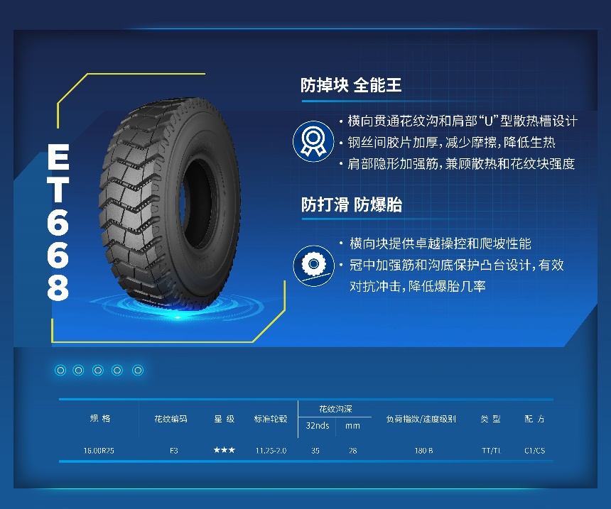 ET668轮胎是泰凯英专门为一般路况场景而研发的宽体车轮胎,独特的结构设计使其完美解决了轮胎散热问题,有效降低了轮胎早期掉块问题;同时,轮胎横向块和加强筋等设计,则让轮胎具备了防打滑和防爆胎能力。