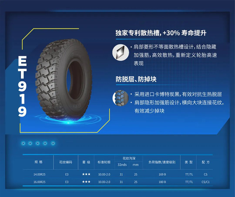 考虑到沙特的自然环境和气候条件,发热问题无疑是工程轮胎面临的最大挑战。而ET919恰恰是为高热场景而生的宽体车轮胎,ET919轮胎肩部采用了钻孔的特殊设计,使热量能够更快地分散,以应对高热工作条件;同时,其还采用了更加耐热的原材料配方和特殊加强的肩部设计,大幅增强了轮胎的防掉块和防脱层性能。